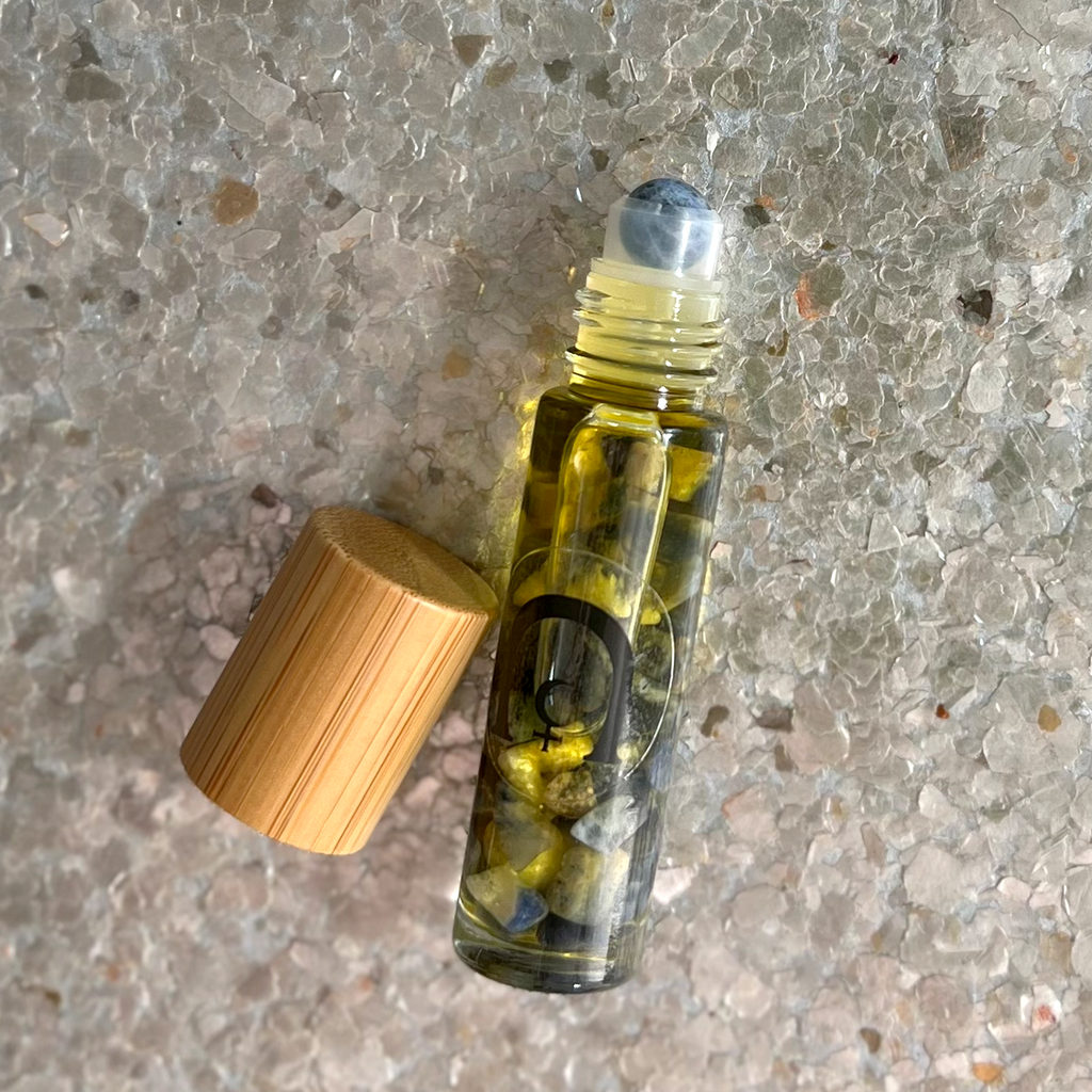 A natural essential oil blend of Palo Santo and Cypriol with Cistus and mixed Rose. 10ml glass bottle with roller ball applicator made from semiprecious Sodalite stone, as well as Sodalite stone chips within which infuse the oils with energy frequencies that are known to bring mental clarity and a new sense of pathways. Recommended to promote balance and protection from negative or draining psychic energies. Hand blended in Hollywood, California, and charged under the Sturgeon Full Moon, the last Supermoon of 2022. This scent represents a spiritual choose your own adventure. Natural oils suspended in a Jojoba carrier.