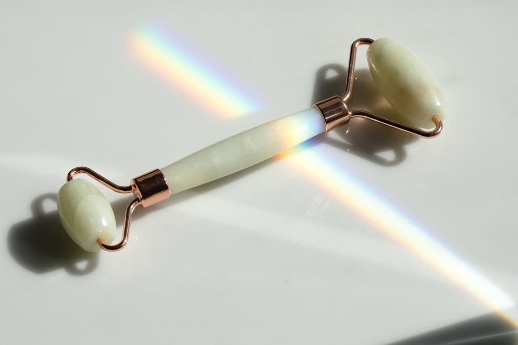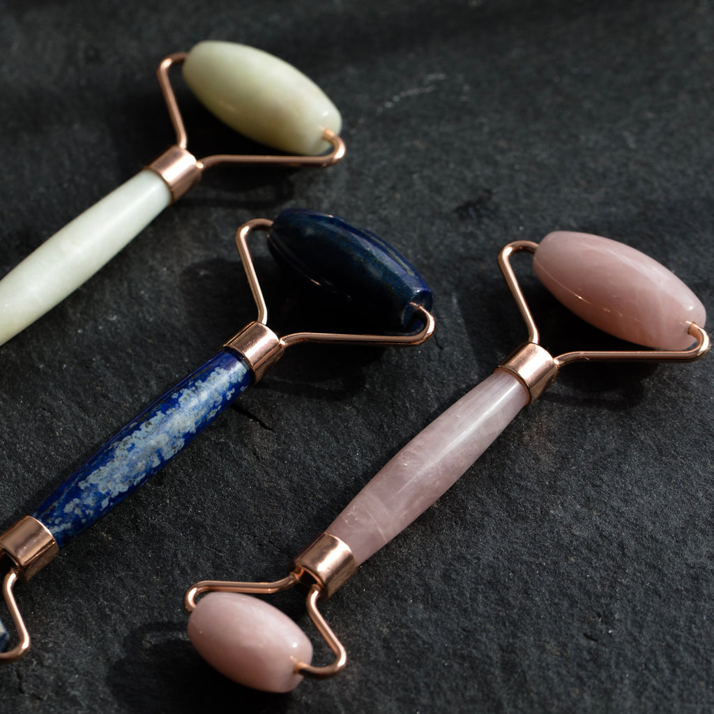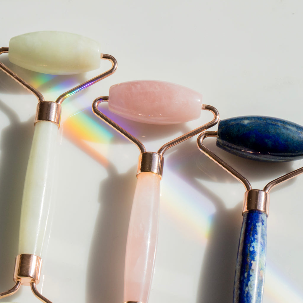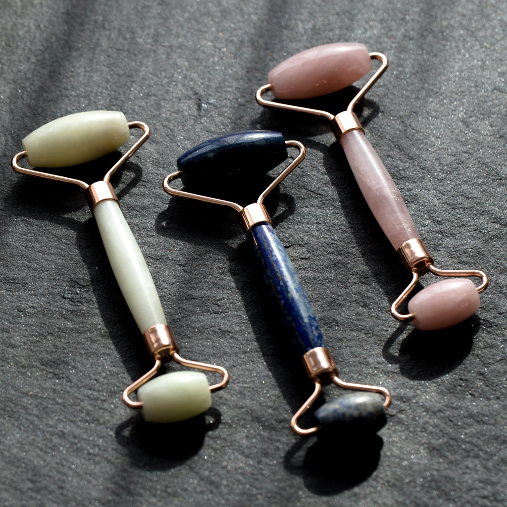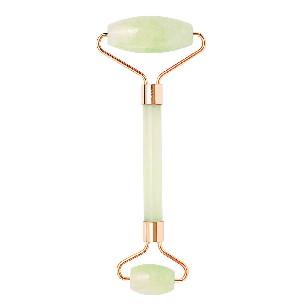 Lucky jade stimulates relaxation and harmony. Promote elasticity of the skin and de-puffing while easing muscle tension. Relaxing dual rollers for face and neck. Natural pale green semi precious Jade stones will vary in matrix and tone. 6" L, rose gold finish.