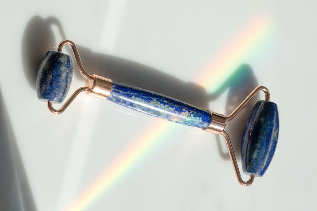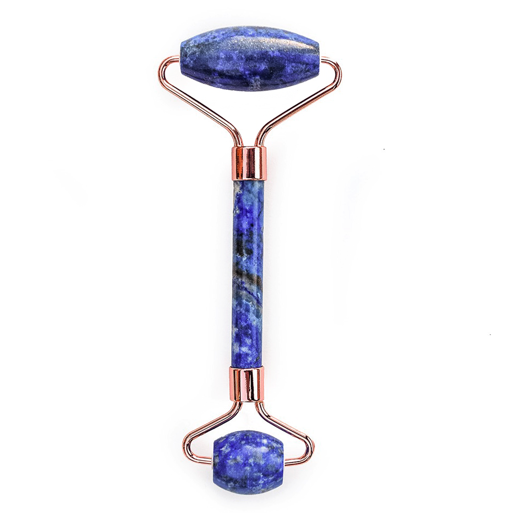 Support the throat chakra and stimulate relaxation. Promote elasticity of the skin and de-puffing while easing muscle tension. Relaxing dual rollers for face and neck. Natural semi precious Lapis Lazuli stones will vary in matrix and tone. 6" L, rose gold finish.