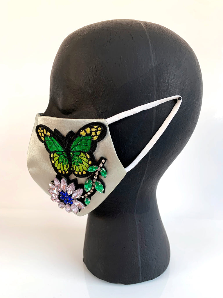 Free flying and still staying safe. An embroidered butterfly and rhinestone flower adorn a pale sage green colored silk face covering with elastic ear loop. Lined, washable (air dry).