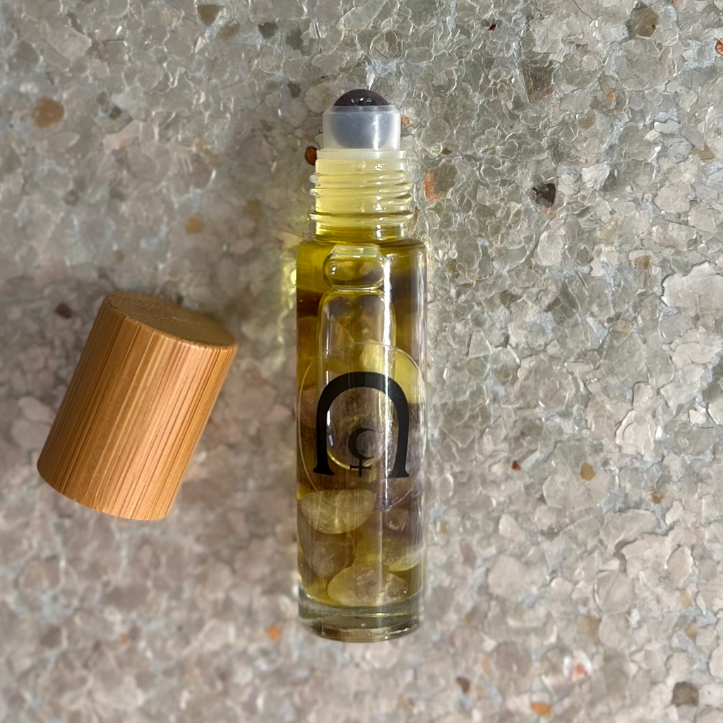 A natural essential oil blend of Amyris, Cedarwood, and Sandalwood. 10ml glass bottle with roller ball applicator made from semiprecious Amethyst stone, as well as Amethyst chips within which infuse the oils with high vibrational energy frequencies that are joyous, spiritual, and individualistic. Recommended to promote creativity, faith, and love. Hand blended in Hollywood, California, and charged under the Sturgeon Full Moon, the last Supermoon of 2022. This scent is woody. Natural oils suspended in a Jojoba carrier.