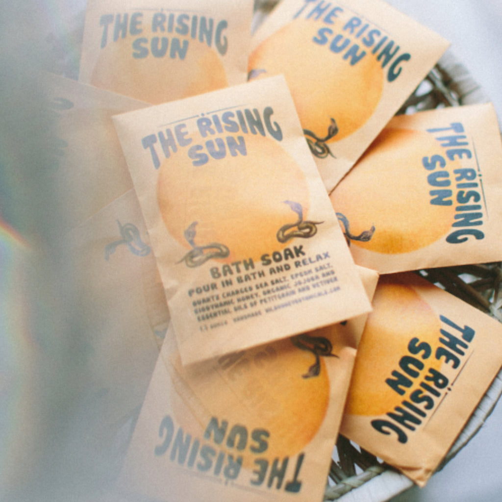 Rising Sun Gem + Honey Infused Minerals Soak/Scrub. This bath mineral salt is a mixture of crystal quartz charged sea salt, epsom salt, bio dynamic honey, organic jojoba and organic essential oils and resins. Can be used as a bath soak or a scrub. 2 oz. packet. Vetiver, petitgrain. All natural.