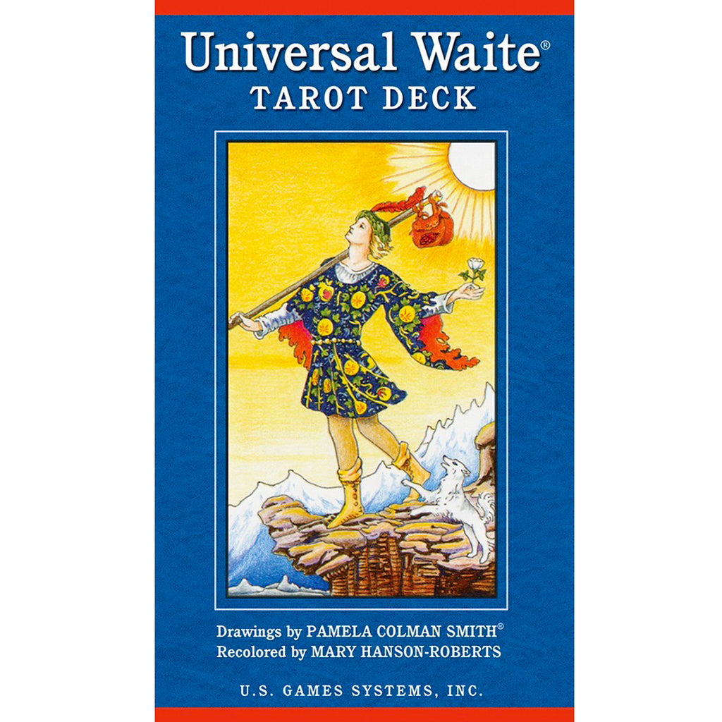 Classic style drawings of Pamela Colman Smith, recolored by artist Mary Hanson-Roberts. Based on the original symbolism of the Rider-Waite artwork. Universal Waite tarot deck cards measuring 2.75" x 4.75". Complete with 78 cards and instruction booklet. Made in Italy.