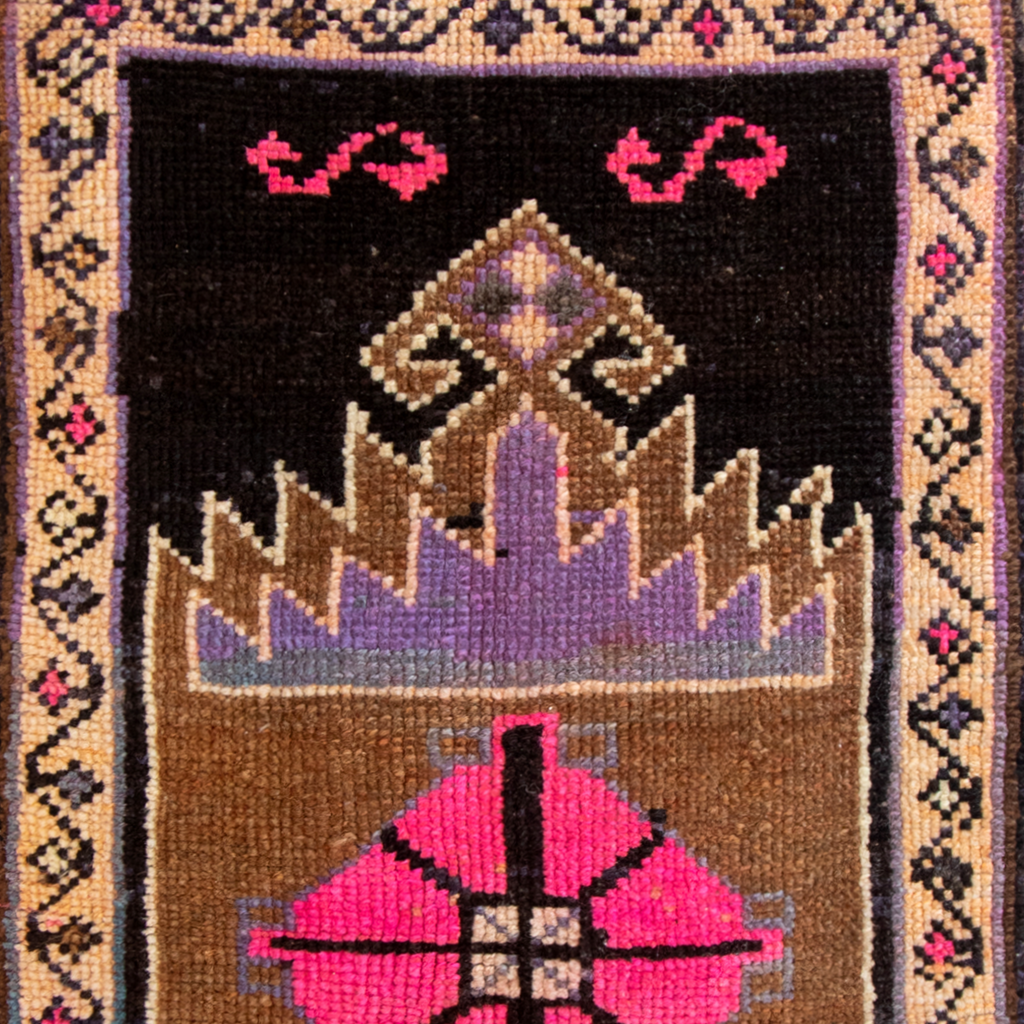 This small size prayer rug is perfect for altar tables, entryways, or as a wall hanging. Lovely colors in this one; desaturated lavender and dusty blue are offset a red-brown background. A bright magenta flower pops in the center. One of a kind, handmade in Turkey. 19" x 37"