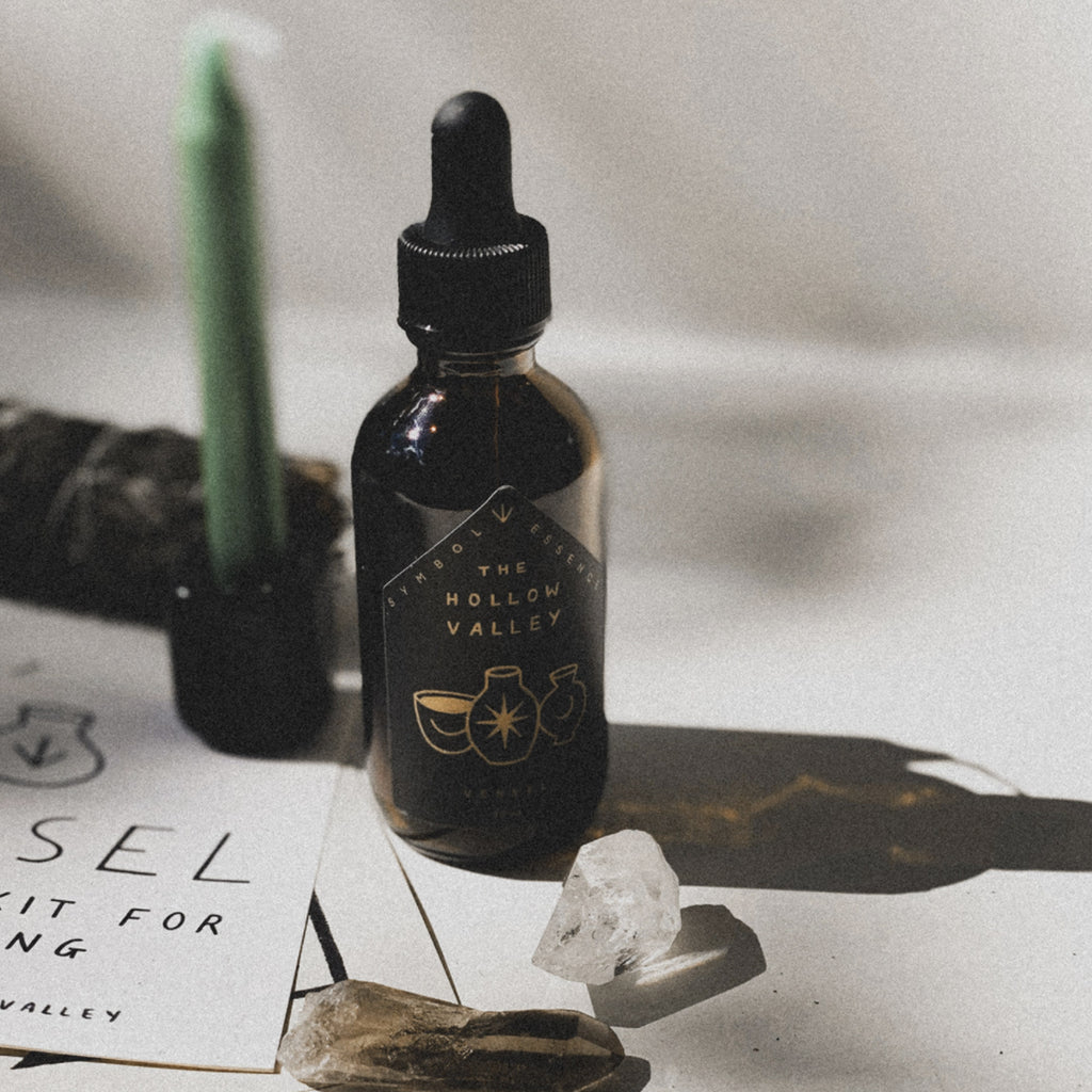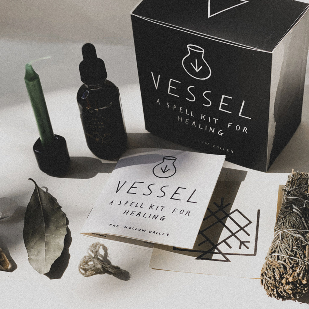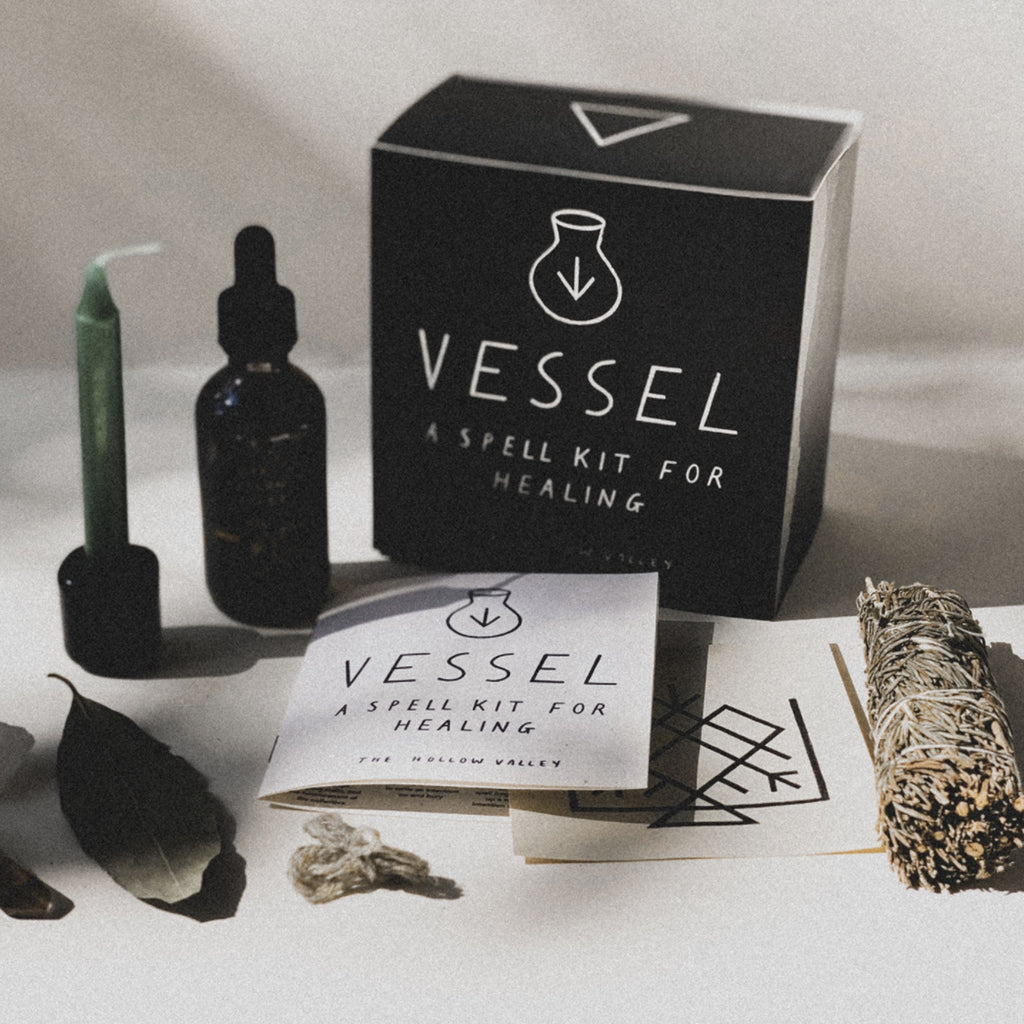 A spell kit for healing: + for nourishment and protect while experiencing deep shifts and radical change + for believing in your capacity for renewal + to encourage a safe container to process grief and find peace Includes: candle, two gemstones, 60 ml custom essence blend (contains alcohol), rosemary bundle, bay leaf, 8-page intuitive spell crafting zine, mini print, sigil + more. Everything you need to cast an intuitive spell for HEALING. 5" x 5" w x 3" h