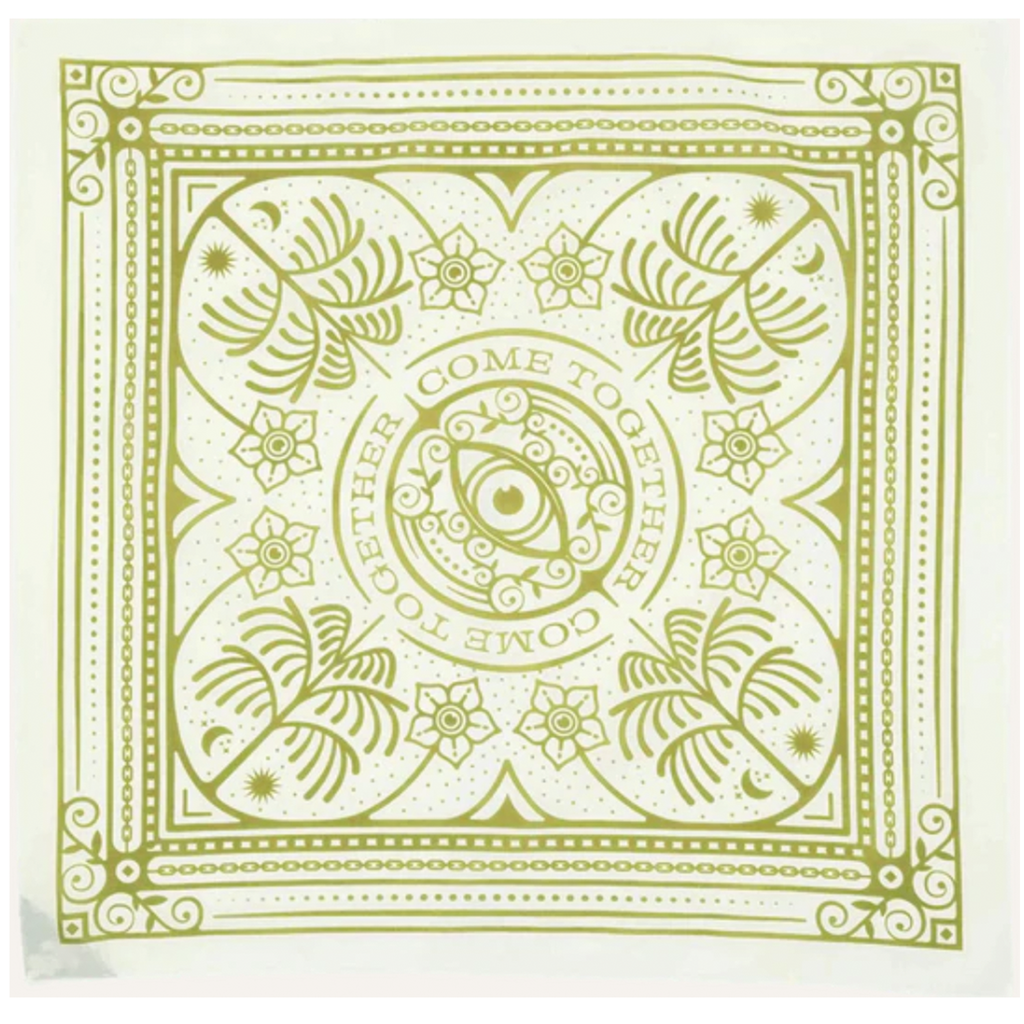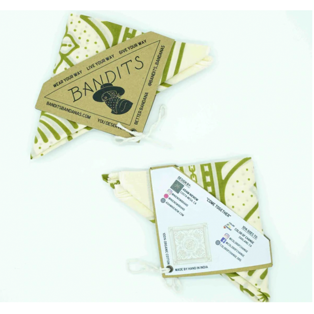 Bandits Bandanas donates 10% of each design's proceeds to different charities chosen by each designer. Come Together is Designed by Southern California artist Adam Nienow, Supporting Color Of Change, for Social Justice and Rights; "inspired by the idea of everyone for once seeing eye-to-eye, and growing into who we need to be as human beings."