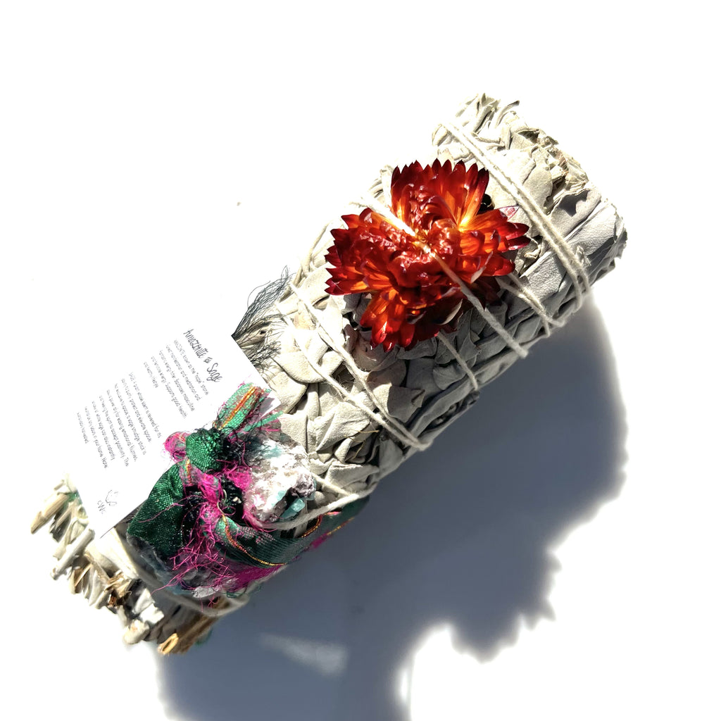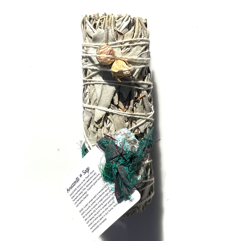 1 Amazonite crystal (healing to the heart and throat chakra, Amazonite is key for open communication) wrapped around an ethically sourced California White Sage ~5"L x 2"W with a distressed recycled silk sari ribbon & decorative dried flower (dried flower may be burned if desired - do not burn crystal). Size and color may vary.