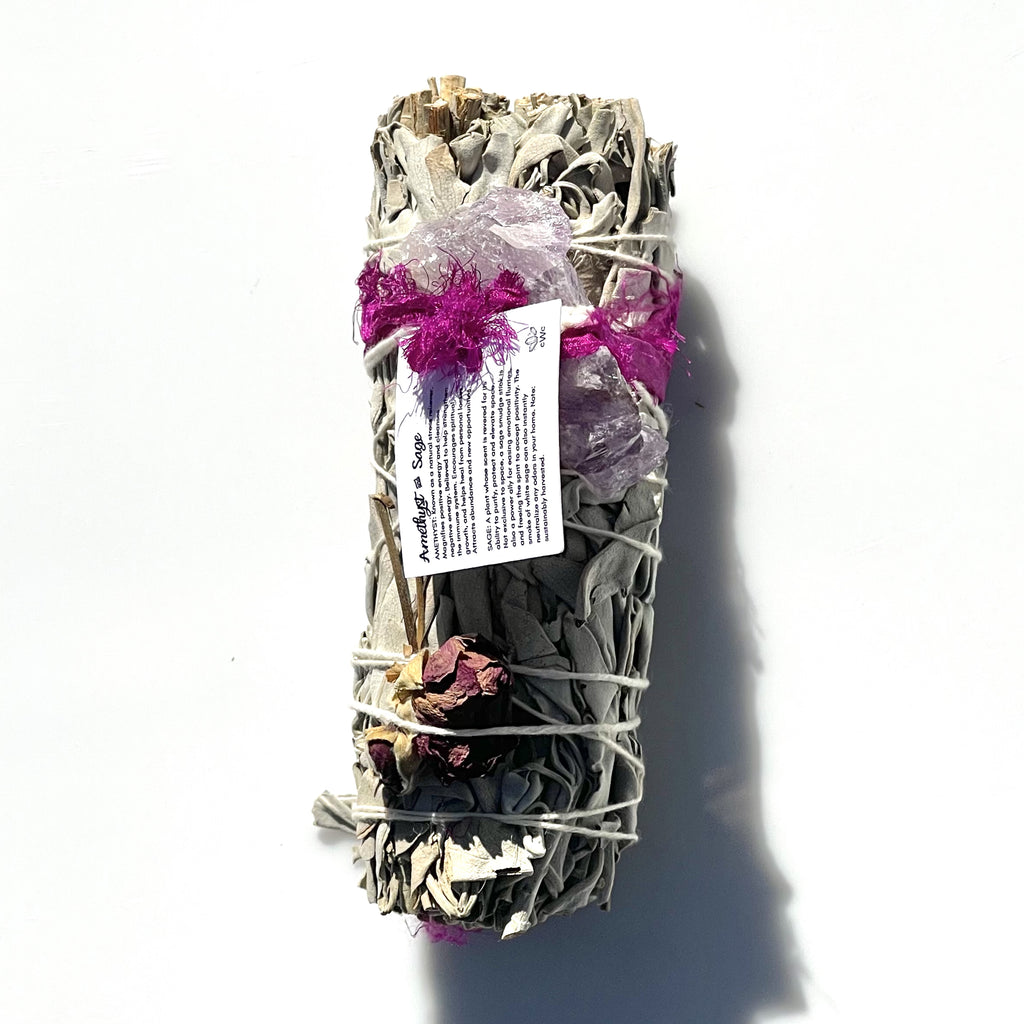 1 Amethyst crystal specimen wrapped around an ethically sourced California White Sage wand~5"L x 2"W with a distressed recycled silk sari ribbon & decorative dried flower (dried flower may be burned if desired - do not burn crystal). Each bundle includes a crystal & energy clearing description. Each piece is one of a kind. Size and color may vary. Products are charged & cleansed in ritual, and infused with reiki when they are made.