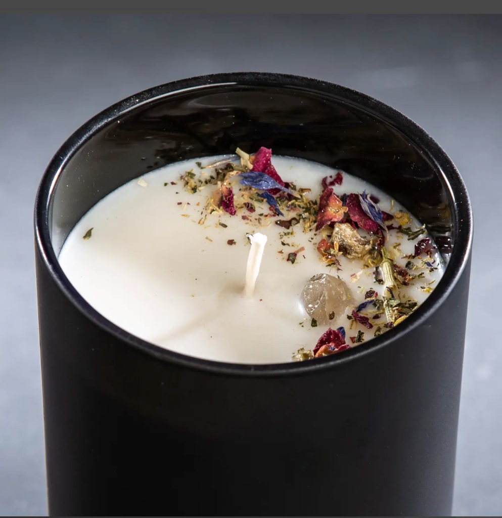 Cotton wick, GMM-free soy wax, organic coconut oil, organic botanicals, High John the Conqueror root, mica, proprietary blend of organic essential oils encasing a crystal charged under the full moon.