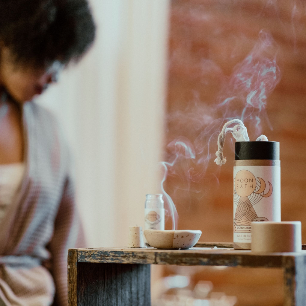 This Burn Blend Smudge by Moon Bath uses four sacred plants from around the world; Frankincense, Copal, White Sage and Lavender, making a sweet and earthy tone for ritual self care. Cleanse your space and spiritually connect.