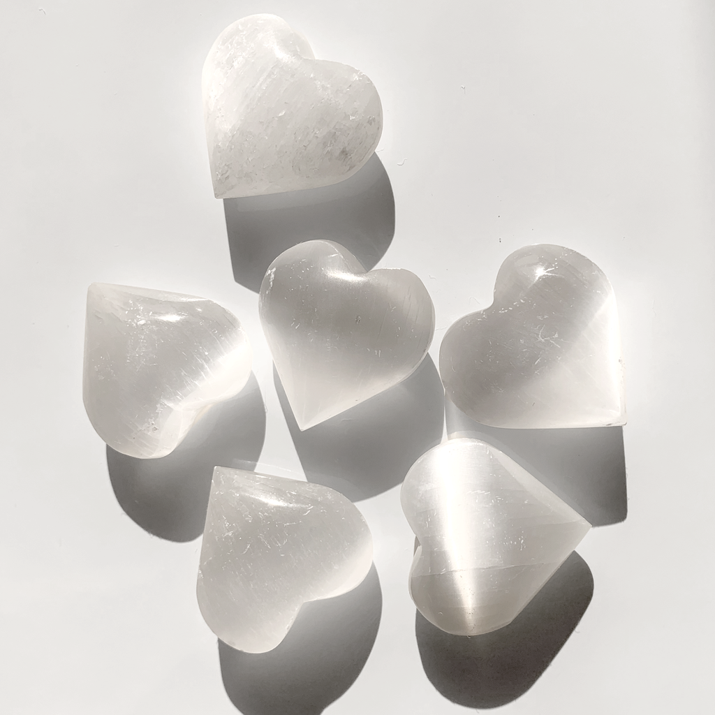 Natural Selenite has a frequency vibration with cleansing properties that are believed to promote calming energy with peaceful vibrations. This small hand carved heart is a talisman for clarity and peace. Spiritually, Selenite's universal quality makes it a great crystal for beginners or a crystal for gifting. Selenite is a soft semiprecious mineral crystal with a transparent or pearlescent tone that looks opaque and also catches refractions in the light. These hearts measure approximately 1.75-1.5" and vary slightly due to nature of hand carving.