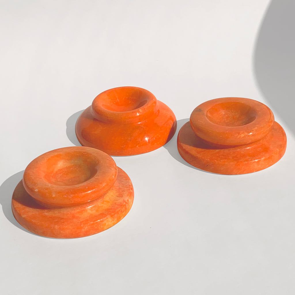 Round footed stone stand, 2.5" diameter, 0.9" tall. Dyed quartz hand lathed in Pakistan, shapes and tone very slightly. You will receive one orange stand hand selected for you or inquire within to make a selection of your own. Perfect for holding spheres and rounded carvings.