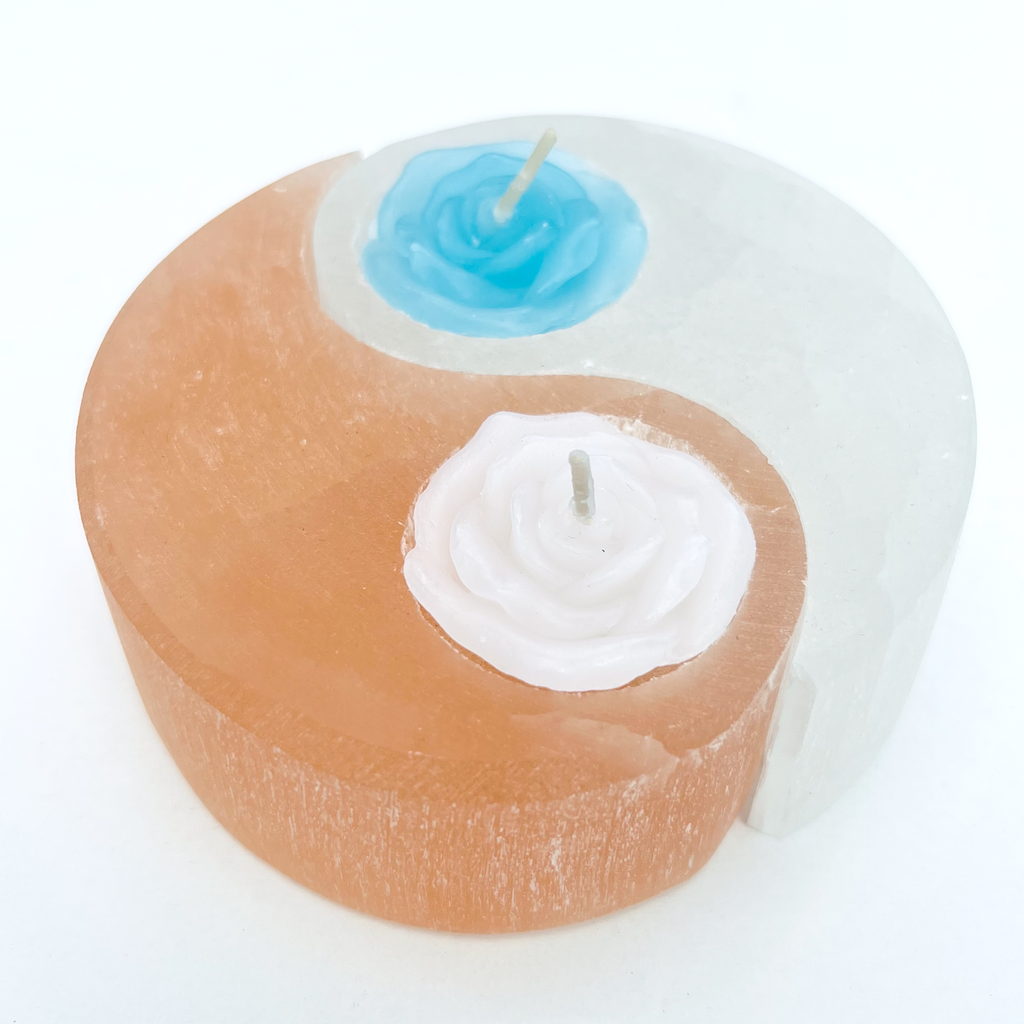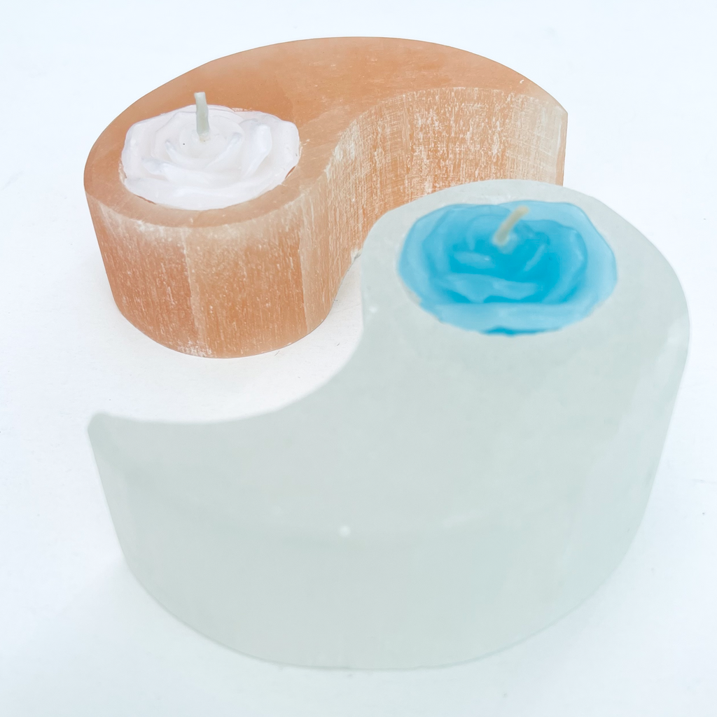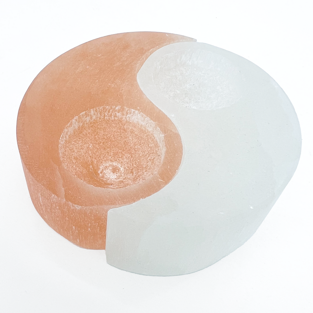 One part peach selenite and one part white selenite makes this carved yin yang, which can hold votives, crystals, spheres, spells, and such. A nice sturdy addition to your altar decor; measures 1.5" high, and 4.5" diameter when positioned as a complete circle. Each side has a 1.5" concave opening. Includes one pale blue and one white unscented flower votive.