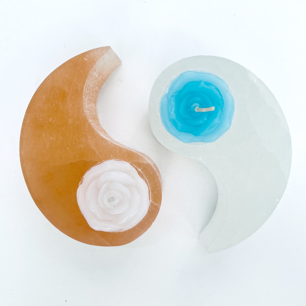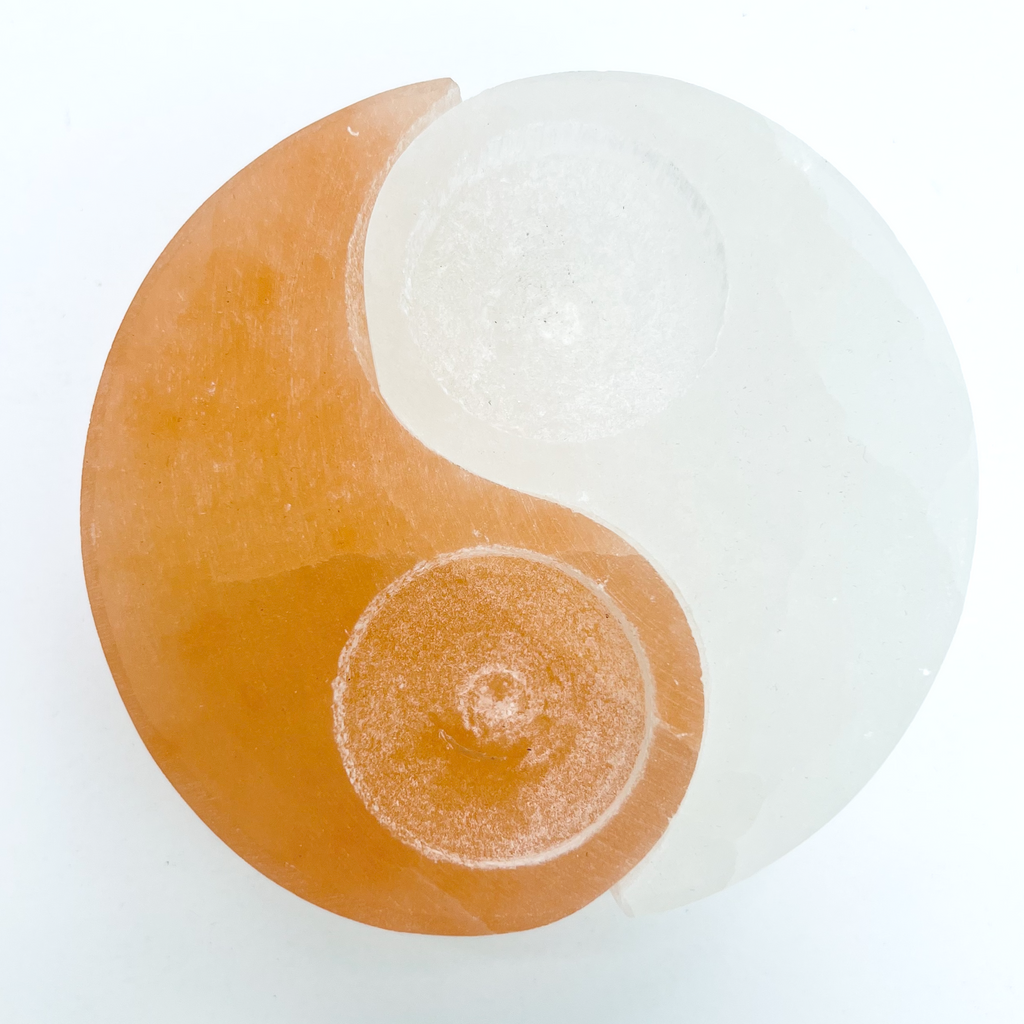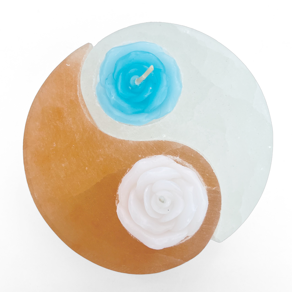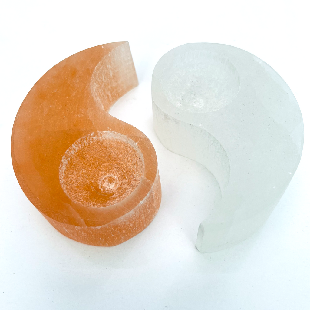 One part peach selenite and one part white selenite makes this carved yin yang, which can hold votives, crystals, spheres, spells, and such. A nice sturdy addition to your altar decor; measures 1.5" high, and 4.5" diameter when positioned as a complete circle. Each side has a 1.5" concave opening. Includes one pale blue and one white unscented flower votive.