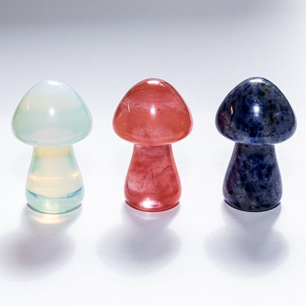 Bring a touch of luck and spiritual vibes into your life with this Sodalite Mushroom! This unique gemstone is beautifully sculpted with intricate detail and a deep blue hue. Place it in your home to elevate your energy and cast away bad juju. Summon some luck and good vibes with this lucky mushroom! 🍄 Semiprecious Sodalite stone mushroom, measures 2" tall. Sodalite is a captivating blue gemstone often associated with spiritual insights and inner wisdom. It is revered for its ability to stimulate the third eye chakra, enhancing intuition, clairvoyance, and deepening one's spiritual understanding. Sodalite is also believed to promote mental clarity, making it a valuable tool for meditation and enhancing communication with spirit guides and higher realms. Its calming energy can help individuals release fears and phobias, facilitating a harmonious balance between the logical mind and intuitive faculties. Sodalite is a trusted companion for those seeking to expand their spiritual awareness and deepen their connection with the unseen world.