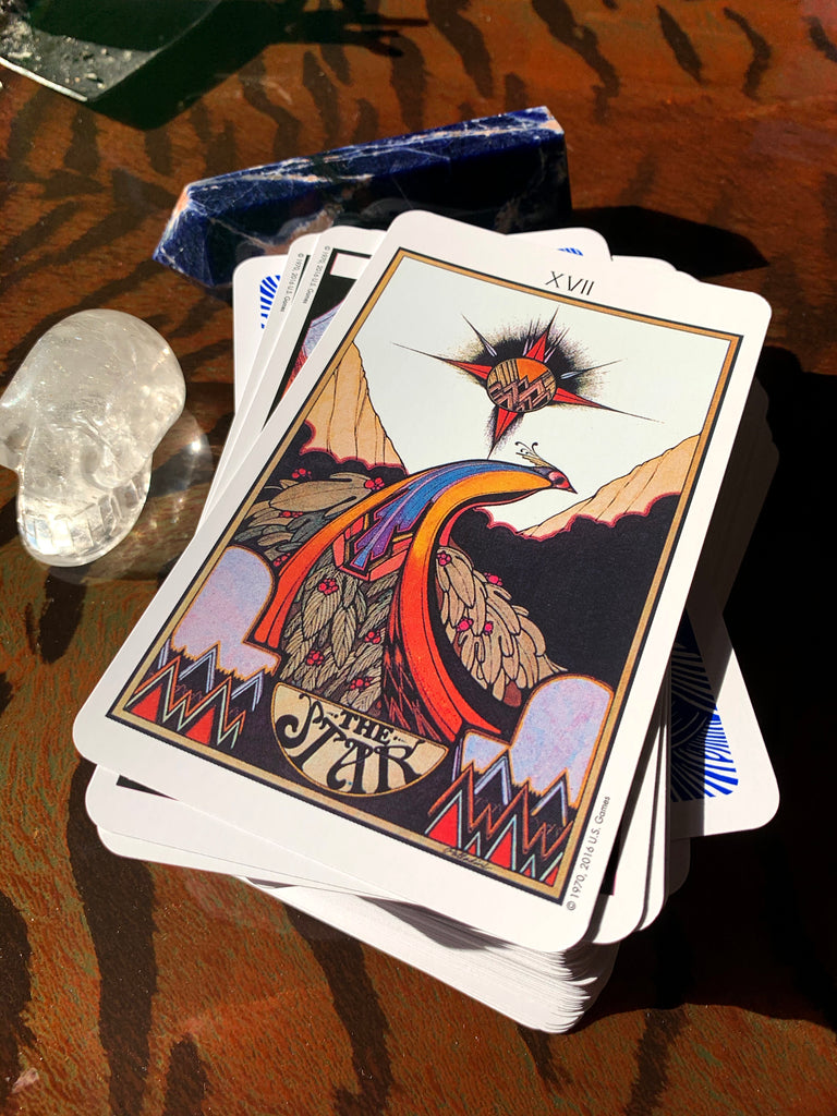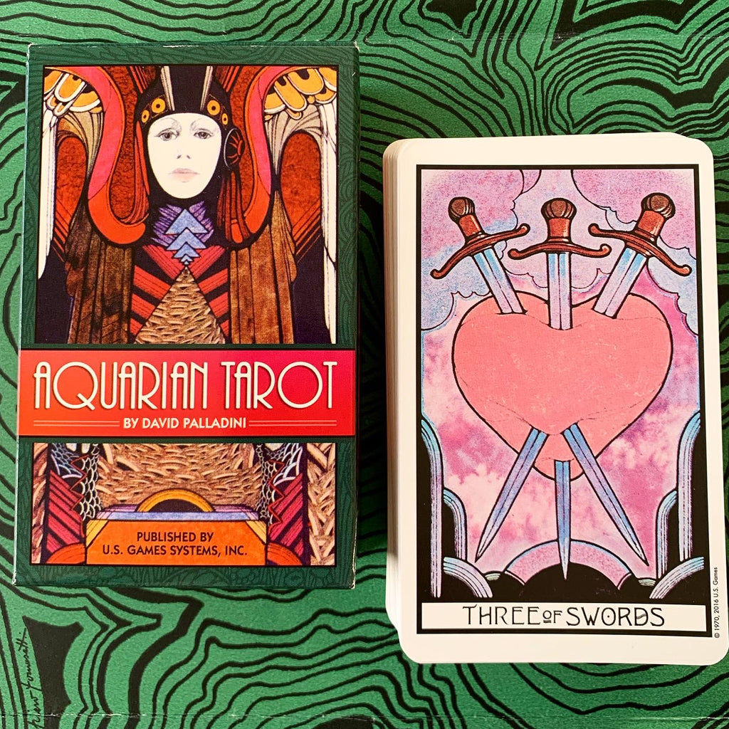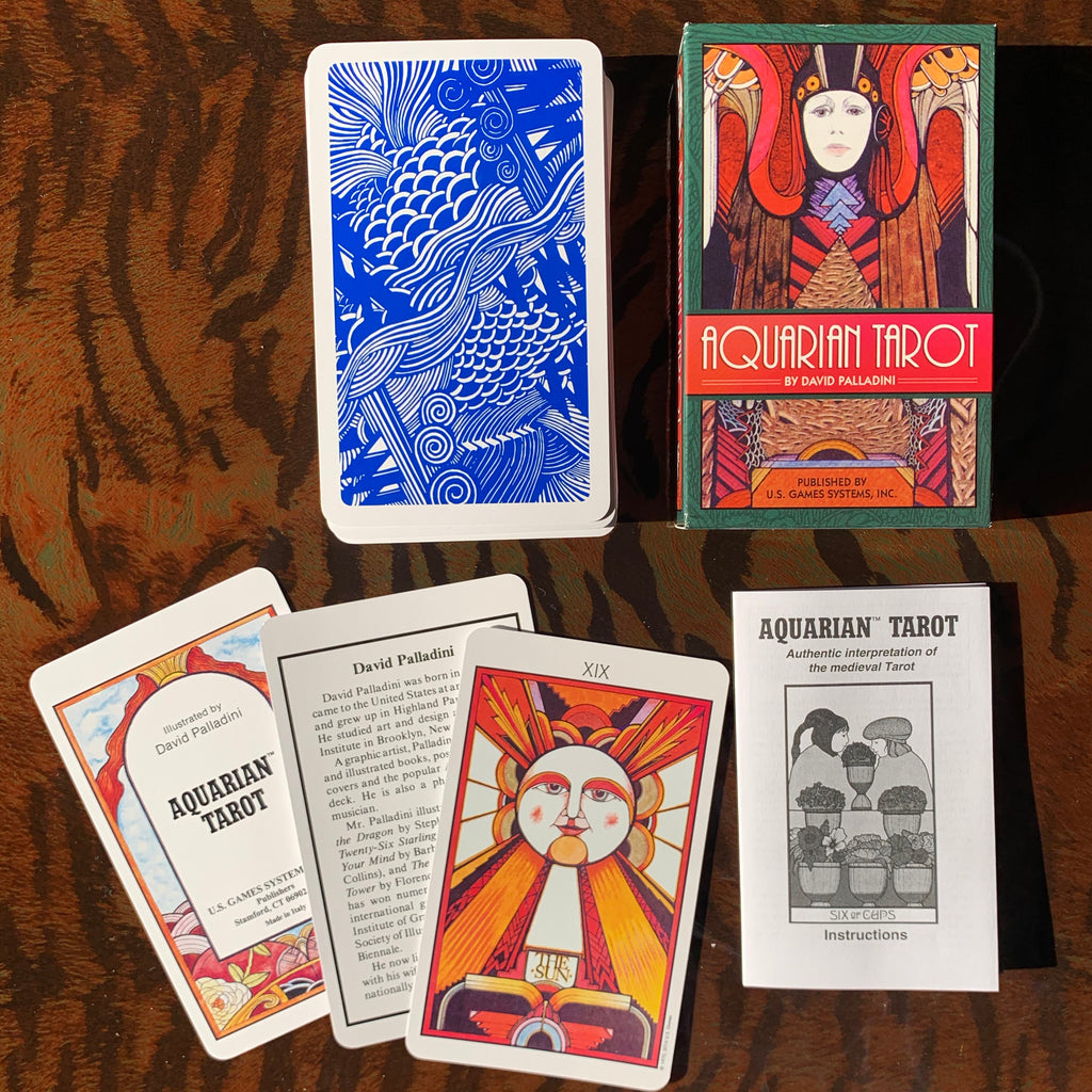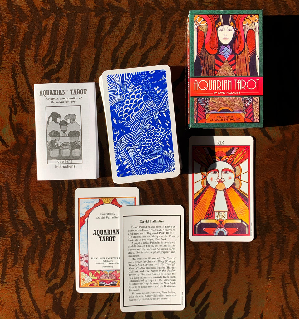 This is medieval tarot symbolism depicted in an Art Deco meets Art Nouveau style of illustrations, created by 1970s illustrator David Palladini; this deck definitely gives retro futuristic and is ironically ahead of its time, a la Bladerunner or Xanadu. Aquarian Tarot includes 78 cards and instruction booklet with meanings. Cards measure 3" x 4.625", made in Italy. If you are looking for a cool deck that's traditional with a vibe and you love retro aesthetics Aquarian Tarot will not disappoint.