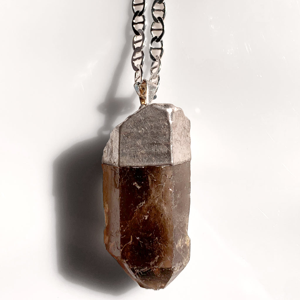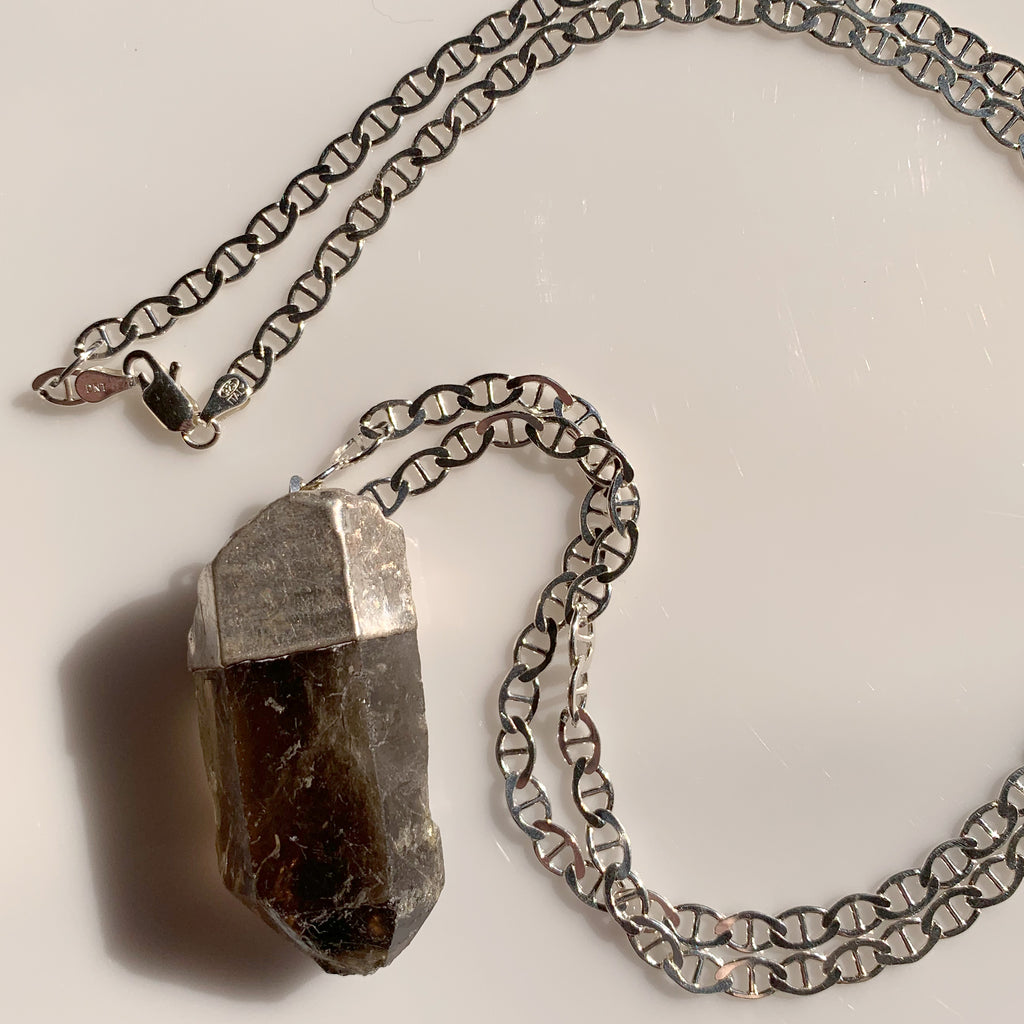 Large raw smoky quartz crystal pedant with plated finish, each measuring 2". One unique pendant will be selected for you, or inquire within to make a selection of your own. Comes on 30" flat mariner or "Gucci" style link (5mm), sterling silver, made in Italy.